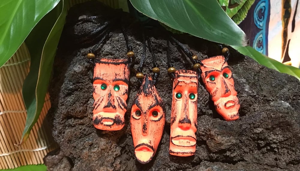 Available now!!! Handmade and hand painted using authentic 1950s molds, these tiki necklaces/rearview mirror charms have never been in production until now. Designed by Red Garnant Indy and Ascot car builder and mechanic. Red was a machinist for whamo in the 1940s to 60s. Red made the first Hulahoop and Frisbee. Available in 4 styles and 4 colors and measure roughly 2 1/2” x 1“ inch in size. Tikis glow in the dark and glow in black light. A fun item for Luaus or your favorite Tiki Bar.
